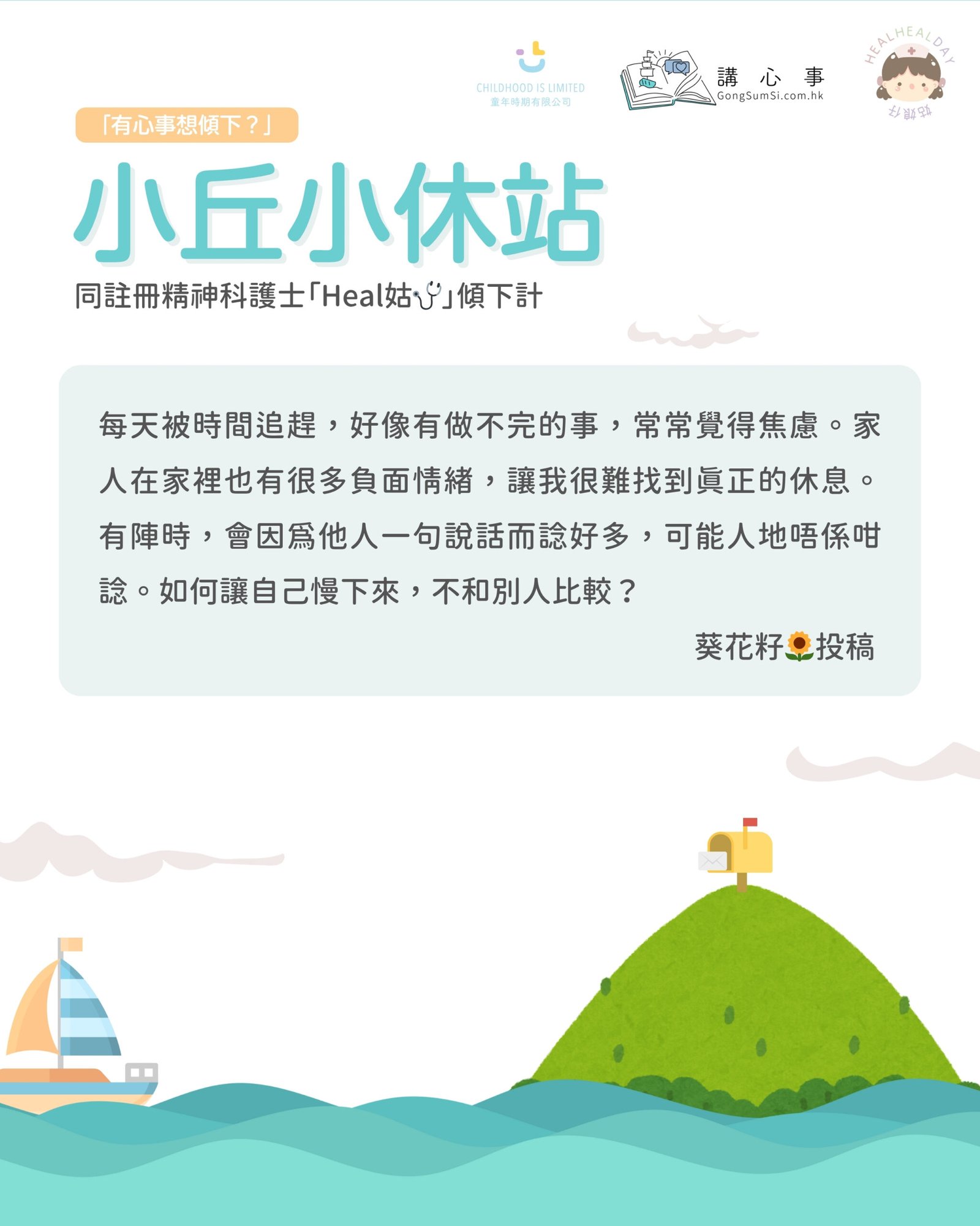 「每天被時間追趕,好像有做不完的事,常常覺得焦慮。家人在家裡也有很多負面情緒,讓我很難找到真正的休息。有陣時,會因為人定一句說話而諗好多,可能人地唔係咁諗。如何讓自己慢下來,不和別人比較?」- 葵花籽🌻投稿